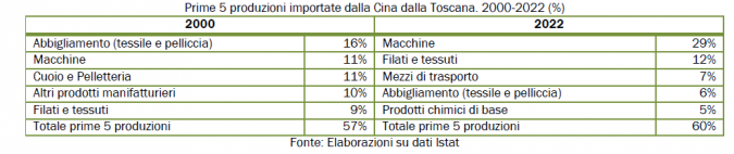 Dalla Cina la Toscana importa prevalente macchine (29%), filati e tessuti (12%).