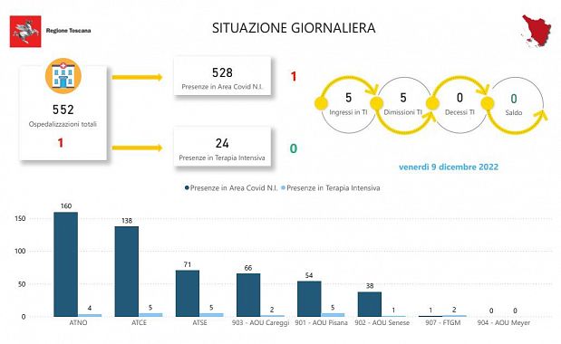 Gli attualmente positivi sono oggi 71.645, -0,3% rispetto a ieri. I ricoverati oggi sono 550 (1 in meno rispetto a ieri), di cui 24 in terapia intensiva (stabili). Nel grafico sottostante la situazione negli ospedali toscani.