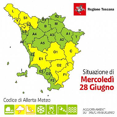 La sala operativa di protezione civile regionale ha diramato un bollettino d'allerta con codice giallo valido fino alla mezzanotte di oggi 28 Giugno per temporali forti e rischio idrogeologico.