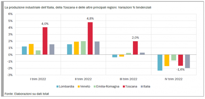 TOSCANA — Chiusura con arretramento della produzione industriale per il 2022 in Toscana che nei primi tre trimestri aveva registrato una performance migliore rispetto a quella nazionale, sostenuta dalle esportazioni che sul 2021 hanno fatto registrare un +8,4%: il dato emerge dall'ultima nota congiunturale rilasciata dall'Istituto regionale di programmazione economica (Irpet).